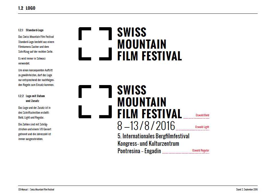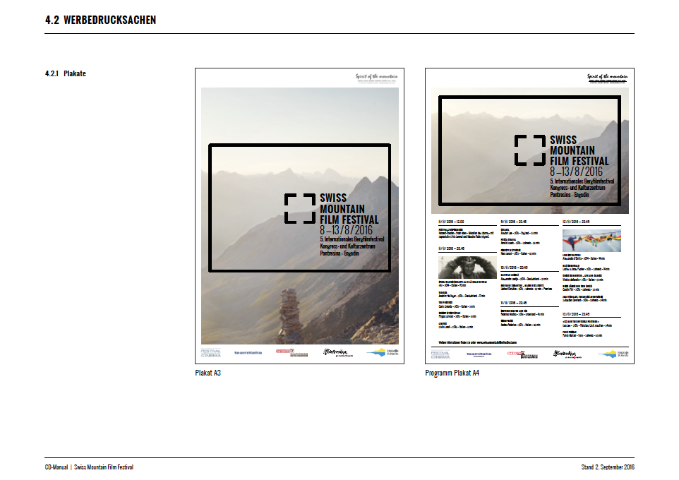 Das Swiss Mountain Film Festival arbeitet wie der Sucher im Display einer Filmkamera. Die Besten der besten «Mountain Movies» werden gesucht und gelangen in den Fokus der Jury. Dieses Gefühl soll durch das Erscheinungsbild vom «Swiss Mountain Film Festival» vermittelt werden. Die Gestaltungselemente eines «Suchers» setzen die Berge in Szene und verleihen dem Erscheinungsbild den typischen Charakter des «Bergfilmfestivals».