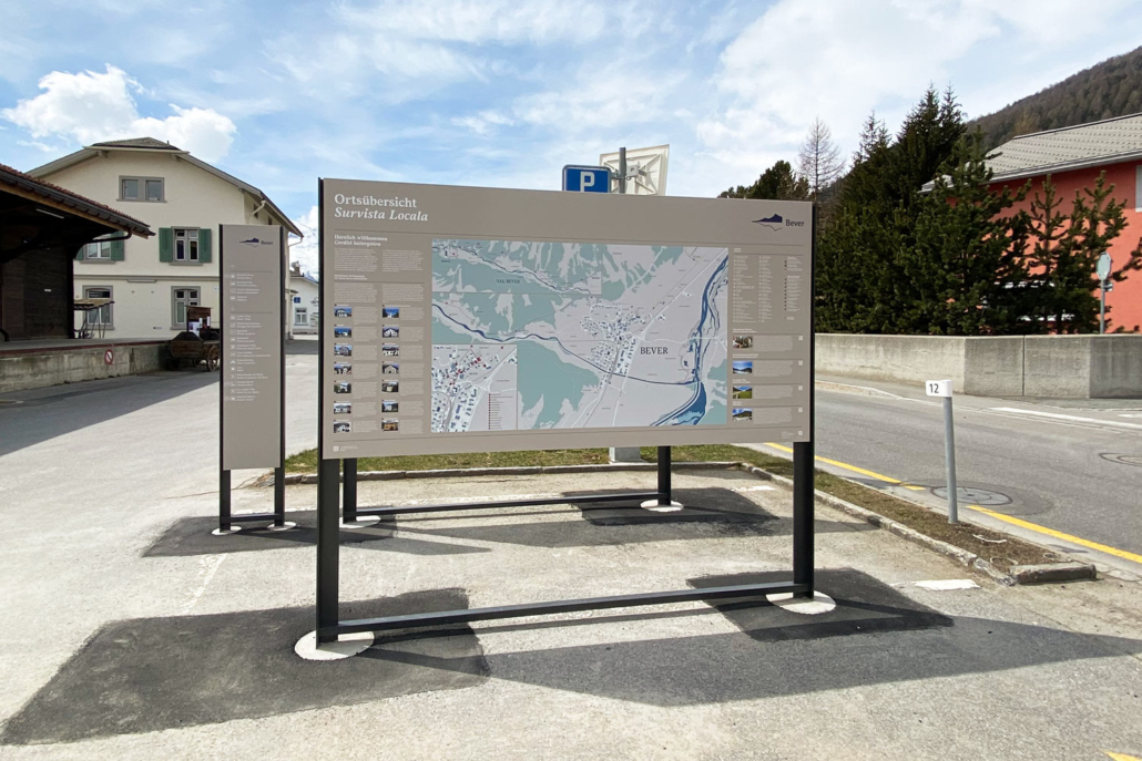 Die neue Signaletik beinhaltet Richtungsstelen und grosse Infotafeln. Diese zeigen die Sommer- und Winterpanoramas vom Oberengadin und den Ortsplan inklusive historischem Dorfrundgang und den Highlights des Märchendorfes Bever.